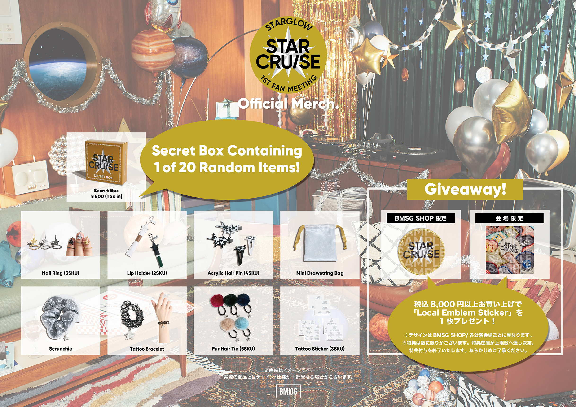 BMSG SHOPにて「STARGLOW 1st Fan Meeting -STAR CRUISE- Official Merch.」商品を税込8,000円以上お買い上げでLocal Emblem Sticker (BMSG SHOP Ver.)を1枚プレゼントいたします!
