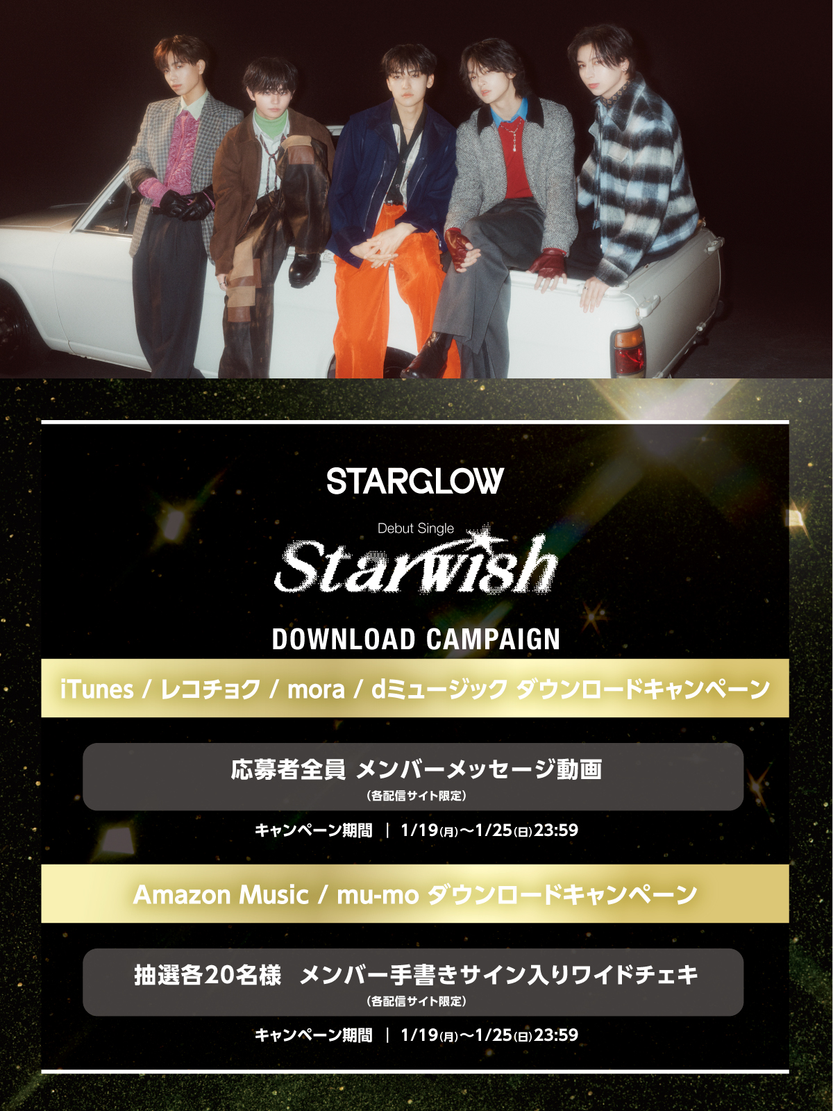 Amazon Music (デジタルミュージック MP3ダウンロード) にて、STARGLOW「Star Wish」をダウンロード購入された方の中から、抽選で20名様に「Amazon Music限定 メンバー手書きサイン入りワイドチェキ」をプレゼント